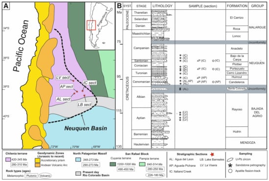 (A) Geological setting of the Neuquén Basin in the back-arc region of Southern Andes between 40° and 36° S latitude with locations of the sampled sections (modified after [48]). (B) Stratigraphy of the Cretaceous and lower Cenozoic filling of the Neuquén Basin with stratigraphic positions of the studied samples. Modified after [14], where also references on geochronological ages for different source terranes are reported.