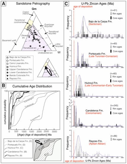 Sandstone provenance has been intensively studied in the last 10 years in the Andean retro-arc basins, frequently using U–Pb dating of zircon grains as the main or unique approach [13,14,15,16,47,48,49,50,51]; however, many of these geochronological studies concern the Meso-Cenozoic sedimentary sequences of the northern and southern sector of Andean mountain building [13,52,53,54,55,56]. Here, we particularly focus on the data reported in the regional studies by Di Giulio et al. [14,16]. These studies, performed on the Cretaceous part of the Neuquén Basin, reveal a distinct shift in sandstone provenance related to a change in source exhumation patterns of parent rocks as well as lag time across the basin-scale pre-Cenomanian unconformity that divides the Bajada del Agrio and the Neuquén Groups [13,14] (Figure 1B). Sandstone petrography of the same stratigraphic interval consistently shows a shift from a mixed to a volcanic arc signature across the Cenomanian unconformity that divides the Rajoso from the Candeleros Formation, and it shows a progressive return toward a mixed and then to cratonic signature along the Neuquén Group (Figure 2A). More specifically, sandstone detrital mode changes mostly reflect the variable abundance of fine-grained volcanic rock fragments in the studied formations, reaching a maximum in the lower Candeleros Formation and then rapidly decreasing up-section in the Neuquén Group. Consistently, U–Pb dating of zircon grains from clastic units across the unconformity in the Rayoso Formation and then along the Neuquén Group distinctly records an abrupt change of detrital age populations.