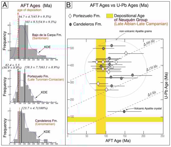 Up-section (above Candeleros Formation), the progressive decrease of syndepositional volcanics and/or juvenile volcanic material is visible, as well as substitution by older zircon grains (Figure 2B,C). The picture is completed by geo-thermochronological data on apatite grains (U–Pb dating and fission tracks), that is, the double-dating method (Figure 3). Double-dating of apatite crystals was preliminarily used to detect possible synsedimentary volcanic contributions because AFT data is useful for unravelling the exhumation story of parent rocks within the upper few kilometers (i.e., their exhumation above the AFT annealing temperature). The results (Figure 3B) show that most of the analyzed apatite grains had a nonvolcanic origin, as their U–Pb and AFT ages were significantly different (delta age spanning from 150 to more than 300 Ma). Only one exception showed zero delta age between U–Pb and AFT ages, thus confirming its volcanic origin. For the nonvolcanic apatite grains, two broadly different age populations can be recognized and interpreted as two different source regions with respect to their tectonic history and lag time, defined as the difference between the AFT age and the depositional age of the rock. The sources are: (1) a rapidly exhuming region delivering apatite grains with AFT ages very close to the depositional age (very short lag time, ca. 10–20 Ma), shown by the single peak in Candeleros Formation (123.7 ± 4.7 Ma) and the youngest peak in Portezuelo and Bajo de la Carpa Formations (82.4 ± 5.5 and 94.7 ± 4.7 Ma, respectively), and (2) a sector delivering apatite grains with AFT ages several tens of Ma (>50 Ma) older than the depositional age of samples. This is inferred by the presence of a second older population in Portezuelo and Bajo de la Carpa Formations (158.3 ± 7.7 and 163 ± 9.5 Ma, respectively). Generally, a longer lag time testifies to the erosion of rocks that remained above the AFT annealing temperature for a considerably long time before arriving at the surface [36]; in addition, the proportion of the second source increases up-section (Figure 3A).