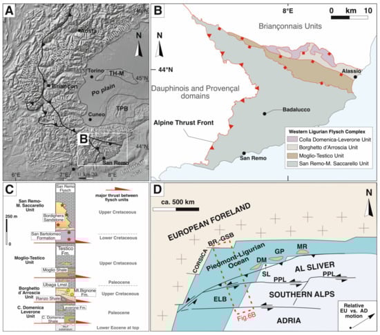 (A) Tectonic scheme of the Western Alps and location of Western Ligurian Flysch Complex (WLF); ATF: Alpine Thrust Front; U-E: Ubaye–Embrunais nappe; TH-M: Torino Hills–Monferrato arc; TPB: Tertiary Piedmont Basin. (B) Structural scheme of the WLF. (C) Stratigraphic framework of the WLF units and stratigraphic position of studied samples. (D) Paleogeographic reconstruction proposed for the Late Cretaceous setting of the Piedmont–Ligurian subduction zone along the Ligurian Alps transect, redrawn after [48]; BR-GSB: Briançonnais–Gran San Bernard domain; DM-GP-MR: Dora Maira–Gran Paradiso–Monte Rosa blocks; SL: Sesia–Lanzo zone; PPL: Paleo-Periadriatic Line; ELB: External Ligurian Basin; AL: Austro-Alpine continental sliver.