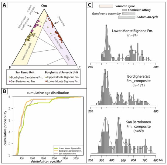 The observed stratigraphic trends in sandstone modal composition in both the San Remo and Borghetto Units raise the question of whether they reflect changes in sediment provenance area (i.e., a provenance shift) or imply a change in tectonic regime affecting the same source area. U–Pb dating of detrital zircon grains was performed to solve this basic provenance question and further constrain source area reconstructions. A total of 356 zircon grains from six samples coming from the San Bartolomeo Formation (two samples), Bordighera Sandstone (three samples), and Mt. Bignone Formation (one sample) yielded concordant ages. Comparisons of the investigated detrital zircon signatures revealed marked similarities (Figure 5B,C; standard statistical evaluations of similarity between samples’ detrital age distributions via KS-tests and MDS diagrams are provided in [17,18]). All detrital zircon age spectra were characterized by their primary Carboniferous age contributions around ca. 300–360 Ma. Significant populations of Ordovician ages around 450 Ma and 480 Ma were also common in all samples. Additional similarities were expressed in the shared broad age population ranging from ca. 535 to 660 Ma. Noteworthy, minor Upper Pennsylvanian-Guadalupian age peaks between ca. 270 Ma and 305 Ma were exclusive to samples of the San Bartolomeo Formation.