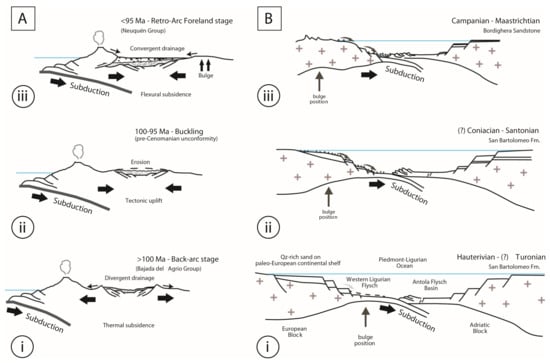 The Neuquén Basin is a Mesozoic–Early Cenozoic foreland basin located in a retro-arc position with respect to the Andean volcanic arc between 34° and 40° S (Figure 1A). Due to its long and fairly continuous subsidence, the basin contains an almost complete record of Mesozoic Andean tectonics, erosion, and sedimentation. The geological evolution of the Neuquén Basin was largely controlled by changes in the tectonic regime along the western margin of South America during the Mesozoic and Cenozoic eras (see [12,14,15,45,46,47] for an up-to-date review). In particular, the Jurassic–Cretaceous evolution has been linked to changes in the subduction slab dip of the oceanic Nazca Plate under the eastern South American continental margin, and to changes in trench roll-back velocities [46], and is characterized by (i) a Jurassic–Early Cretaceous back-arc extensional phase linked to a steeply dipping subduction and (ii) a contractional retro-arc foreland basin phase linked to a temporary shallower dipping subduction due to a change in the absolute motion of South America. The sedimentary record preserved in the continental Cretaceous strata of the Neuquén Basin allows investigating the effects of that transition from an extensional back-arc to a contractional retro-arc foreland setting, notwithstanding that no significant facies changes occurred as depositional environments remained continental with fluvial deposits during the entire Cretaceous evolution (see [14] for a detailed description of depositional facies). In particular, the investigated effects concern (i) switches in source regions of the clastic detritus; (ii) exhumation patterns of source rocks; and (iii) stratigraphic architecture of the basin. Most Cretaceous sedimentary evolution is recorded by a thick continental clastic succession formed by the Bajada del Agrio and the Neuquén Groups, separated by a regional-scale Cenomanian unconformity (Figure 1B). This continental succession has been intensively studied in order to capture the tectonic signal linked to the evolution of that portion of the Andean system.