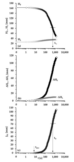 The first stage lasts from t0 up to the time of deviation tdev, defined by Equation (3). In this initial period of the foam decay, rapid efflux of liquid from the fresh wet foam takes place; the bubbles get closer, which leads to the formation of foam films, Plateau borders and nodes. The syneresis dynamics is dominated by the gravity-driven drainage in Plateau borders and nodes, but at the same time, films start to drain as well, due to the capillary pressure in the Plateau borders. Indeed, the amount of liquid drained from such freshly formed (thick) films should be a small fraction of all the draining liquid. However, what is most important in this stage of foam decay is that the films presumably do not coalesce yet. Hence, the decrease in foam height is at this point equal to the increase of the height of the solution beneath the foam (see Figure 1b), that is:
