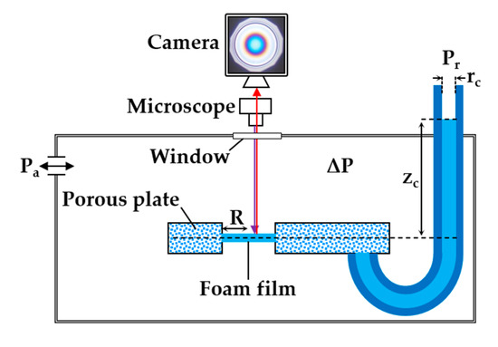 where ΔP is the difference between the pressure applied in the chamber Pa and the reference ambient pressure Pr (usually the atmospheric pressure); Pc and Ph are capillary and hydrostatic pressures, respectively; γ is the surface tension of the solution, from which the film is obtained; rc is the inner radius of the capillary; Δρ is the density difference between the solution and air; g = 9.81 m/s2; and zc is the height of solution in the capillary above the film.