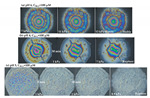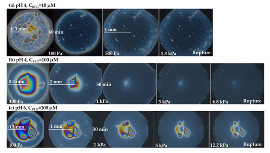 The experiments were performed as follows. In the experimental protocol ‘A’, a foam film was initially formed slowly by a gradual increase of the applied pressure Pa in the sealed chamber. Once the film appeared in the center of the solution drop, Pa was adjusted to yield a disjoining pressure of Π = 100 Pa. For the different solutions in our study, we obtained film radii in the range of 0.2–0.3 mm (Figure 3, Figure 4 and Figure 5). Once the pressure was adjusted, the foam films were left to thin and ideally reach a homogeneous pattern, which would be consistent with films having the same thickness independent of the lateral position within the film. However, this was not always possible due to film dimpling [67], and very slow drainage, typical for protein foam films [19,20,61,67,68,69,70,71], especially at such a low disjoining pressure. Therefore, in many cases, inhomogeneous thick parts remained immobile within the films (Figure 3, Figure 4, Figure 5 and Figure 6). After that, Pa was increased in small steps of 100 Pa at a rate of 100 Pa/min until the film occupied the complete available area. Under the experimental conditions, this was usually the case at about Π = 1 kPa. Note that at pH 3 the foam films for both studied BLG concentrations of 10 µM and 100 µM were the least stable and ruptured already during this stage, without filling the available area in the film holder (Figure 4). For the other more stable systems, Pa was gradually increased in a continuous mode at a rate of 1 kPa/min until the films ruptured. The disjoining pressure at film rupture is defined as Πcr. Several experiments were performed by a second protocol ‘B’, where the initial Pa was set higher, and the films were rapidly formed at Π ≥ 1 kPa (Figure 6). After that, Pa was gradually increased as in protocol ‘A’. In a few experiments, films were left to relax at a given Π in order to observe the film drainage (see in Figure 3 and Figure 6, and Figure S6 in the Supplementary Materials).