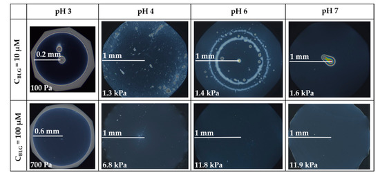The lowest film stability was observed for pH 3 and pH 5 at CBLG = 10 µM, where the films ruptured soon after their formation at Π = 100–120 Pa. At pH 3 and CBLG = 100 µM, the film stability was only slightly higher (Πcr < 1 kPa) in full agreement with the disjoining pressure isotherm for such films reported earlier [61]. For pH 4, 6, and 7 at CBLG = 10 µM, the film stability is higher (up to Πcr = 1.6 kPa). At CBLG = 100 µM, Πcr continuously increased with the pH and leveled off at pH 6 and pH 7, for which some of the most stable films did not rupture up to the highest measurable disjoining pressure of about 13 kPa (experimental limit).