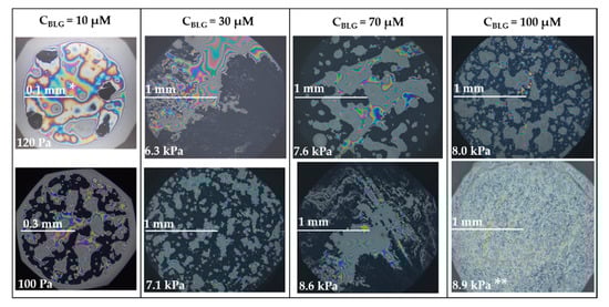 Foam Newton black films (NBFs) at different CBLG (pH 5, Cbuff = 10 mM) formed slowly by protocol ‘A’; the photos were taken at moments close to film rupture. * This film was obtained in a glass tube cell (see Figure S5 in the Supplementary Materials); ** This film was formed rapidly by protocol ‘B’ (see Figure 6c).