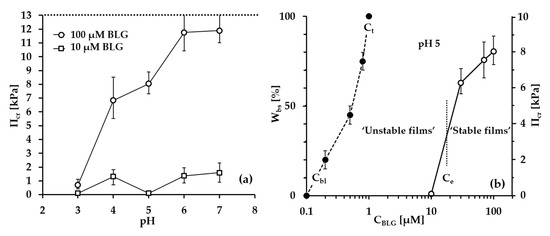 - Group 1: Πcr < . This condition is valid for the foams and films at pH 3 and pH 5 and at CBLG = 10 µM, and can explain the lack of measurable tdev values, where it is possible that the onset of bubble coalescence occurs already in the period of foam formation. These two foams also exhibit the shortest t½ and ttr (in the order of some minutes). For pH 5, this is somehow expected, having in mind that CBLG = 10 µM < Ce and unstable NBF spots emerge in films within seconds (Figure S6 in the Supplementary Materials). For pH 3, the most probable reason is low protein surface excess as suggested by the long induction time in the dynamic surface pressure measurements (Figures S6 and S7 in SI).