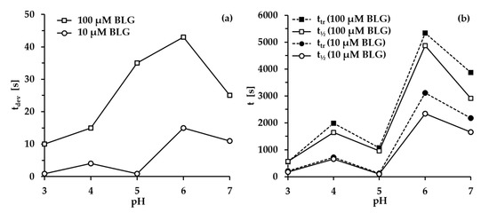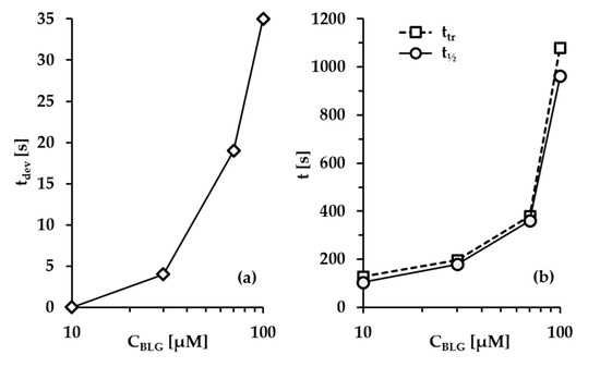 In the special case of foams at pH 5, the effect of increasing BLG concentration from 10 µM to 100 µM is the strongest and changes the shape of the tdev(pH) dependence (Figure 8a). Figure 9 presents measured tdev(CBLG)pH5, t½(CBLG)pH5 and ttr(CBLG)pH5 dependencies. In all cases, a gradual increase in the foam stability was observed with increasing CBLG.