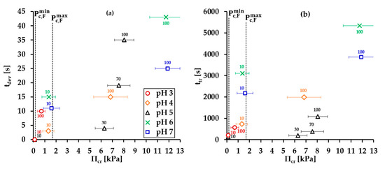 To better illustrate the interrelations between the stabilities of single foam films and macroscopic foams, we plotted in Figure 10 the measured characteristic times tdev(pH, CBLG) and ttr(pH, CBLG) of the foam decay taken from Figure 8 and Figure 9 against the corresponding film critical pressures Πcr(pH, CBLG) taken from Figure 7. We also estimated the approximate values of the capillary pressures in the studied foams on the basis of literature data for the Sauter mean bubble radii r32 in foams obtained in BLG solutions at different CBLG and pH [25,37]. The calculations, presented in the SI, yielded a spectrum of estimated capillary pressures between minimum ≈ 170 Pa and maximum ≈ 1.7 kPa values (indicated as dashed lines in Figure 10) for all studied foams.
