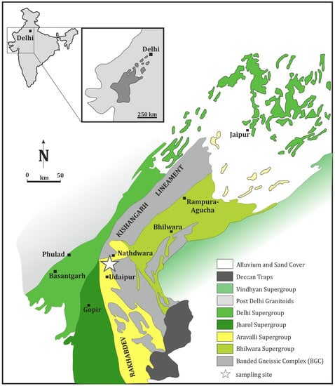 The Aravalli Mountain Range have been assigned to three litho-stratigraphical units, which correspond to three independent geological cycles [10,15,16,17]: (1) crystalline basement of Rajasthan, known as the Banded Gneissic Complex (BGC), (2) Aravalli Super-group, and (3) the youngest Meso-Neoproterozoic Delhi Super-group (Figure 1).