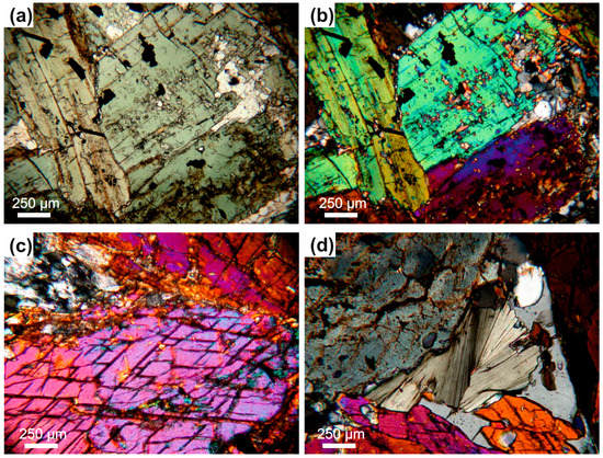 The suspect pillow lava from Aravalli has a preserved, fibrous, spinifex-like texture (Figure 2c,d). Such type of crystal arrangement develops as a result of large thermal gradients, coupled with conductive and radiative heat transfer within olivine or/and pyroxene crystals fixed in the cool upper layers of the lava flows [21,22]. All samples collected from natural outcrops are found to consist of amphibolite facies mineral assemblage, dominantly comprising crystals of calcic amphibole (Figure 3a–d) with only single pyroxene relicts accompanied with plagioclase (Figure 4a,b), apatite, ilmenite, chlorite (Figure 3d or Figure 4a) and epidote (Figure 4c,d) with allanite (Figure 4c). Small baddeleyite grains were also observed.