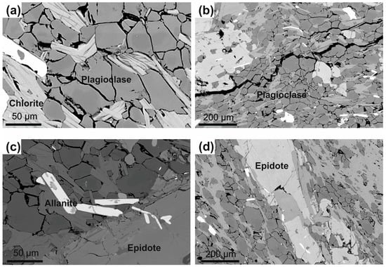 Backscattered-Electron (BSE) micrographs of the studied samples from the Aravalli area. (a) retrogressive Mg chlorite with plagioclase grains, (b) euhedral plagioclase grains, (c,d) accessory allanite and epidote after plagioclase.