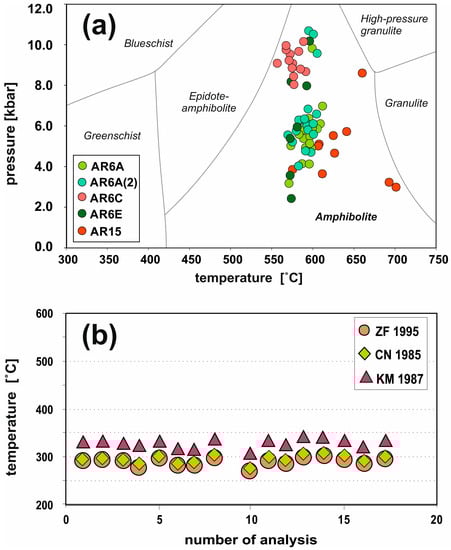 The amphiboles, as a mineral phase stable over a wide range of pressure and temperature from 1 to 23 kbar and 400 to 1150 °C [28], are an effective tool used for the estimation of P-T conditions of various Ca-amphibole-bearing rocks. The P-T parameters are usually determined based on the composition of amphibole-plagioclase pairs or amphibole-liquid calibration or amphibole-only calculation. This last option, independent of magma composition, was tested in Aravalli samples. The lava pillows contain different forms of amphibole (Figure 3 and Figure 4), accompanied or not accompanied with plagioclase of oligoclase to andesine composition, which suggests that these rocks did not achieve a state of equilibrium.
