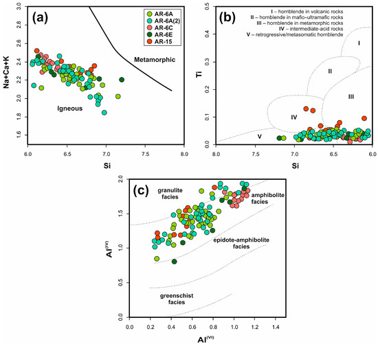 On the other hand, according to [34], amphiboles with Si of 7.3 (apfu) or less are generally considered magmatic and Si higher than 7.3 (apfu) is not a truly magmatic amphibole. In these terms, the Aravalli amphibole crystals plot as igneous, far off of the metamorphic field (Figure 8a). They display a variation of Si content and a sum of Na, Ca, K, whose particular values overlap with the population commonly found in magmatic arc amphiboles. The case of this (Na + Ca + K vs. Si) relationship should be explained, rather, as an indicator of meta-igneous origin. The amphibolite facies metamorphism recrystallized the probable reach of pyroxene protolith. An almost-analogous diagram (Na + K) vs. Si is used as a discriminator of protolith for ortho- vs. para-amphibolite [35].