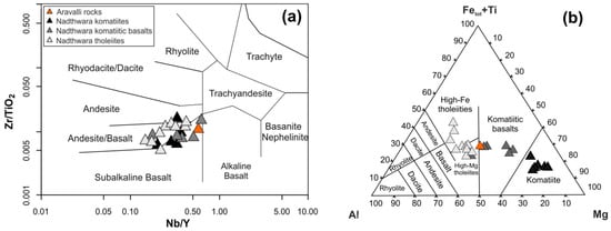 (a) Zr/TiO2 vs Nb/Y plot after [41], (b) Al-(Fetot + Ti)-Mg diagram after [42] for the AR-6C sample and Nathdwara volcanic rocks (data from [10]).