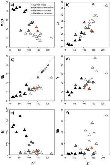 Bivariate plots of Zr (as an index of fractionation) versus selected elements for the AR-6C sample and Nathdwara rocks (data from [10]). (a) major oxide (MgO) vs. Zr, (b–f) trace elements (La, Nb, Y, Ni, Rb) vs. Zr.
