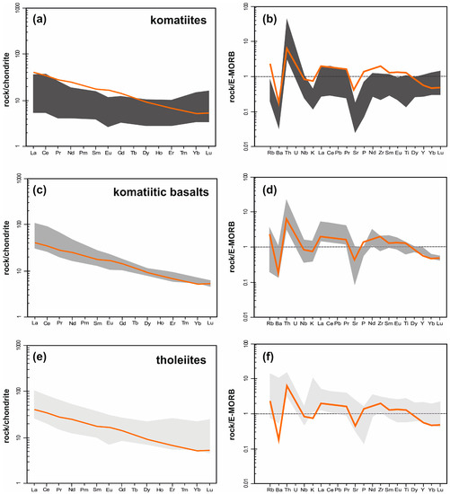 (a,c,e) chondrite-normalized REE patterns for komatiite, komatiitic basalts and tholeiite respectively (normalizing values after [43]), (b,d,f) E-MORB normalized multielement spider diagrams (normalizing values after [44]) for the komatiite, komatiitic basalts and tholeiite respectively (data from [10]), REE and multi-element patterns of AR-6C (brown line) shown for comparison.