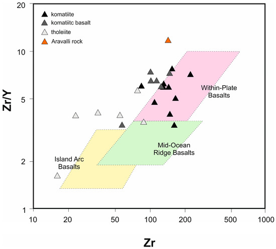 However, the komatiitic samples plot mostly below the normalized ratio line 1, indicating their derivation from less enriched mantle sources by higher degrees of partial melting compared to the tholeiite and komatiitic basalt samples, although depicting similar depletion of Nb, Sr, Eu, P and Ti, like the tholeiite and komatiitic basalt, indicating rift tectonic environment [10]. The tectonic interpretation is confirmed by the Zr/Y vs. Zr plot [46] where the Aravalli samples plot within or close to the “Within-Plate Basalt” field (Figure 12).