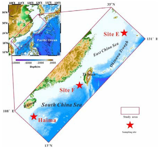 Location of three sampling sites (red star) in the northern South China Sea and in the East China Sea.