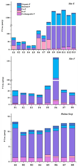 Positive correlations are evident between Ca-P and Fe2O3 in the carbonate deposits of Site F and Haima in the South China Sea (Figure 3), which are characterized by lower P contents. Positive correlations could be observed in the samples from Site E as well as the samples are divided into high P (P2O5 > 2.5%) and low P groups (P2O5 < 2.5%) for comparison. However, Fe2O3 does not exhibit correlation with organic-P, detrital-P, exchangeable-P, or Fe-P at the three sites.