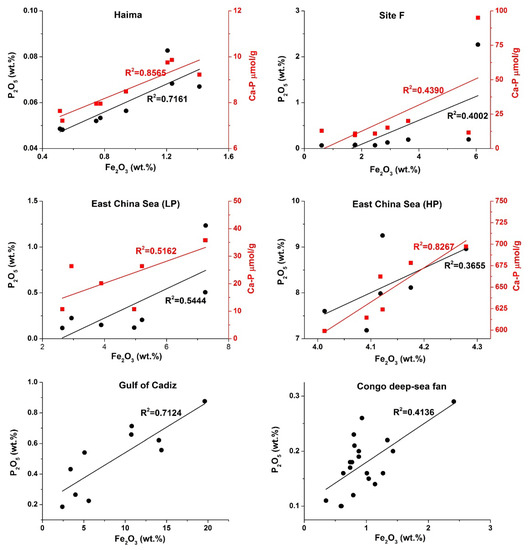 Positive correlations between P2O5 (wt.%) and Fe2O3 (wt.%), Ca-P (μm/g), and Fe2O3 (wt.%) from carbonates in Haima, Site F, and Site E. Positive correlation between P2O5 (wt.%) and Fe2O3 (wt.%) also found from carbonates in Congo deep-sea fan [7] and Gulf of Cadiz [6].