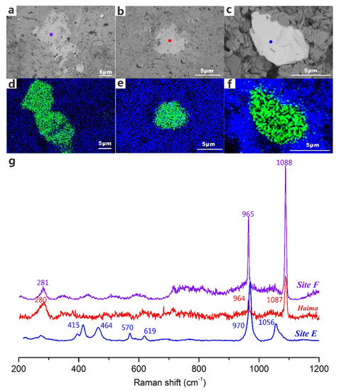SEM observations and elemental mapping of thin sections and freshly fractured carbonate rocks reveal the presence of detrital-P in the carbonates from the three cold seeps (Figure 5). EDS analyses reveals that these grains are composed primarily of Ca, P, and O, and may therefore be phosphate minerals (Figure S6). The Raman spectrum at ~965 cm−1 provides evidence for the presence of detrital apatite in the samples. The peaks at ~280 cm−1 and ~1088 cm−1 represent coexisting calcite in the matrix of these samples. The other peaks at ~464 cm−1, ~619 cm−1, ~970 cm−1, and ~1056 cm−1 represent monazite, which is another detrital phosphate mineral in the carbonates from Site E (Figure 5g, Table S3).