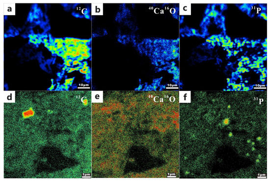 Elemental mapping using NanoSIMS provides further evidence for the presence of P within the Ca-carbonate minerals, indicating that it may be Ca-P (Figure 6). The distributions of 12C−, 40Ca16O−, and 31P− are consistent with each other at Site E and Site F, although the intensity of 31P− in Site E is higher than that from Site F. The 12C− and 40Ca16O− distributions illustrate the matrix, which is composed by Ca-carbonate mineral (calcite) and identified by Raman spectra. The high consistency in the distributions of 40Ca16O− and 31P− (Figure 6e,f) implies that P may be related to the Ca-carbonate mineral (aragonite and calcite).
