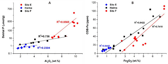 (A) Positive correlations between detrital-P (μmol-P/g) and Al2O3 (wt.%) from carbonates in Haima, Site F, and Site E. (B) Positive correlations between citrate-dithionite bicarbonate (CDB)-extracted Fe (ppm) and Fe2O3 (wt.%) from carbonates in Haima, Site F, and Site E.