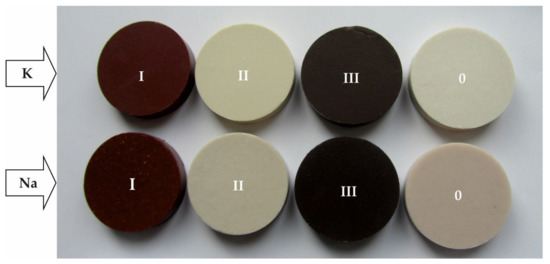 Color after firing of the studied samples: potassium (K) and sodium (Na) types doped with synthetic pigments (marked I-III) plus that of the basic samples (marked 0).