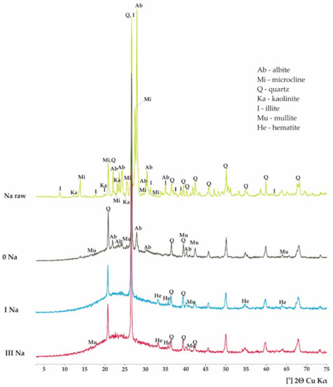 Other reasons for color differences between raw materials of the same or similar coloring oxide contents but of distinct chemical character (sodium or potassium), may be their different behavior during the firing process. The raw material with a higher sodium content forms the liquid phase at lower temperatures than its potassium counterpart. This favors faster phase-to-phase interactions and transition from the crystalline to the liquid state. This may be coupled with releasing iron ions from the lattice of other minerals, which form hematite particles that cause permanent coloring of the material after firing [18]. At high temperatures, some Fe3+ ions may be accepted by structures of newly formed mullite at the isomorphic position. Fe3+ ions can substitute Al3+ ions due to the similar ionic radii of these elements, i.e., Fe3+ = 0.55 or 0.59 Å depending on CN, and Al3+ = 0.54 Å [18,55].