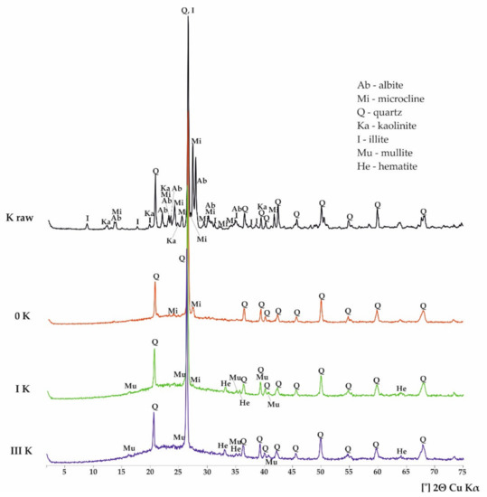 XRD patterns of potassium feldspar-quartz samples in a raw state/unfired (K raw) and the samples after firing: without synthetic pigments addition (0 K), as well as doped with 1.5% Fe2O3 (I K), and with 1.5% Fe2O3 + 0.5% TiO2 (III K).