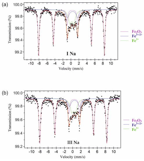 Room temperature Mössbauer spectra of the sodium-rich samples heat-treated at 1200 °C. (a) I Na doped with Fe2O3, (b) III Na doped with Fe2O3 + TiO2.