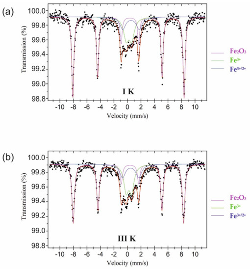 Room temperature Mössbauer spectra of the potassium-rich samples heat-treated at 1200 °C. (a) I K doped with Fe2O3, (b) III K doped with Fe2O3 + TiO2.