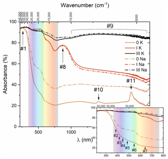 Spectral dependence of the total absorbance in the wavelength range from 220 to 2200 nm measured for selected feldspar-quartz samples after firing is presented in Figure 7. The spectral line shapes of both examined raw material varieties (0 Na, 0 K) are typical for these types of feldspar [27,28]. The presence of a small amount of Fe2O3 in the raw materials (0.30–0.36%) gives a clear manifestation in their optical spectra. In the UV region, a distinct absorption band centered at 262 nm (marked #1) can be observed. It may be assigned to ligand-to-metal charge transfer transitions taking place between O2− and Fe3+ ions (OMCT) probably in an octahedral FeO6 cluster [20,29]. The visible region of the absorbance spectra shows a series of small bands that can be ascribed to d-d transitions within Fe3+ ions. They appear at: 384 (#2), 413 (#3), 448 (#4), 487 (#5), 545 (#6), and 642 nm (#7). These bands may be attributable to Fe3+ ions in tetrahedral (#2–#4) and octahedral (#5, #6) coordination [30,31]. Some authors [20] ascribe the absorption band at around 448 nm (#4) to d-d transitions of octahedrally coordinated Fe3+. It is worth noting that the aforementioned bands are present in both the potassium and sodium feldspar variety spectrum; however, they are more pronounced in the latter one (0 Na). A weak absorption band at around 860 nm (#8) can be assigned to hematite α-Fe2O3 [20,29]. Additionally, between 1000 and 2150 nm a broad band (#9) of weak absorption is observed. Such a band in the near IR may be assigned to the presence of Fe2+ ions [20]. The bandwidth can be, according to the literature [32,33,34], reasonably explained. First and foremost, two bands may overlap, one at around 1100 nm indicating the presence of Fe2+ ions in an octahedral sites and another at around 2000 nm corresponding to tetrahedrally coordinated Fe2+ ions. The reason for overlapping is probably Jahn-Teller distortion of the octahedrally coordinated iron ions. An additional two bands can be distinguished in the absorption spectra of the examined samples, the first centered at 1420 nm (#10) and the second at 1915 nm (#11). They are much more pronounced in the spectrum of K-type feldspar. According to the literature, these bands may originate from the combination of vibration modes of molecular water occurring in alkali feldspars and quartz in the form of microscopic or sub-microscopic fluid inclusions [34,35]. However, to verify this assumption, the additional investigations would be required. Disparity in absorbance spectra of sodium and potassium feldspar may be attributed to the difference in their chemical properties. The chemical surrounding is affected by atomic properties, especially by ionic radius (K+—1.38 Å, Na+—1.02 Å) and electro-negativity (Pauling scale: K+—0.82, Na+—0.93).