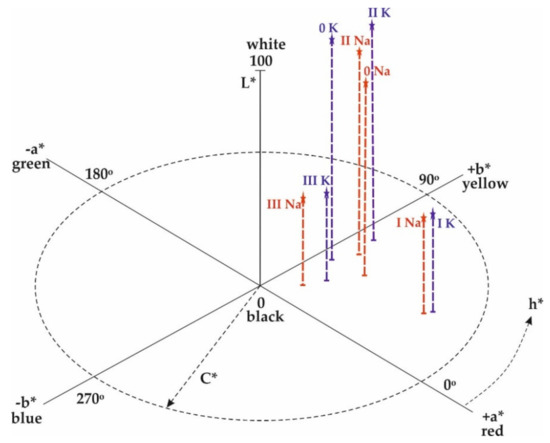 To quantify the color of the studied samples and to examine its variation with the iron and titanium content, the CIE (1976) colorimetric system was used (Table 4 and Figure 8). After firing of the potassium-type raw material, the color is brighter compared to that of the sodium type (which is confirmed by the L* coordinate values of 87.71% and 75.86%, respectively). This results from the difference in light absorption in the visible region between both varieties of the studied material, especially in the range of ca. 400–550 nm (Figure 7). The absorption registered for the sodium sample (0 Na) is more intense than that of its potassium counterpart (0 K). The lower the absorption, the more light is reflected from the surface of the sample and the brighter color is perceived. As a consequence, the observed color of 0 Na sample is pale pink, with the corresponding a* value (6.05) much higher than that of 0 K sample (1.67), which is light grey in color (Figure 1, Table 4).