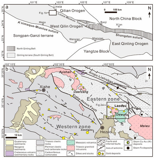 (a) Simplified map showing geotectonic terranes in the Qinling Orogen with the location of the study area [37,38]; (b) geologic map of the Xiahe-Hezuo district showing the distribution of major sedimentary facies, igneous rocks, and Au, Cu-Au-(W), and Fe deposits [39].