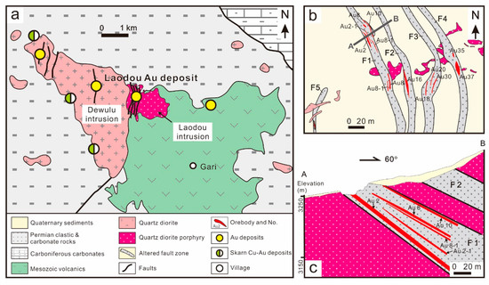 (a) Geologic map of the Dewulu intrusive complex with the location of the Laodou gold deposit. Other hydrothermal lode Au deposits and Cu-Au skarn deposits are also shown [44]; (b) simplified geologic map of the Laodou gold deposit; (c) representative cross section in (b) showing the geological relations between structures, alterations, and gold ores [39].