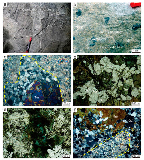 (a) Tourmaline occurs as disseminations in the quartz diorite porphyry; (b) quartz-tourmaline nodules in the quartz diorite porphyry display leucocratic haloes; (c) the leucocratic halo around a quartz-tourmaline nodule is mainly composed of fine-grained quartz and fine scaly sericite; (d) quartz and tourmaline in most nodules are intergrown and characterized by subhedral to anhedral granular textures with straight or ragged boundaries; (e) relationships between tourmaline, quartz, plagioclase, sericite, and muscovite; (f) sericite aggregates remain the pseudomorph of plagioclase or biotite around the quartz-tourmaline nodule. Tur—tourmaline; Qz—quartz; Hbl—hornblende; Ser—sericite; Pl—plagioclase; Ms—muscovite.