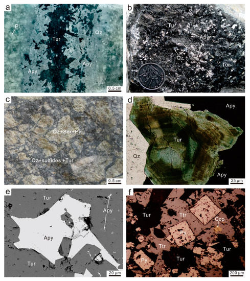(a) Tourmaline occurs as quartz-sulfide-tourmaline veins transecting the quartz diorite porphyry; (b) tourmaline intergrown with arsenopyrite in a quartz-sulfide-tourmaline vein; (c) fine-grained quartz-sulfide-tourmaline cement the breccias of the altered quartz diorite porphyry; (d) tourmaline is characterized by an oscillatory-zoned texture of blue green to brown color, which has sharp, straight boundaries in contact with quartz and arsenopyrite; (e) arsenopyrite exhibits either emulsion or hydrothermal filling textures in type 2 tourmaline; (f) pyrite, tetrahedrite, and chalcopyrite are generally interstitial between tourmaline grains. Tur—tourmaline; Qz—quartz; Pl—plagioclase; Apy—arsenopyrite; Ser—sericite; Py—pyrite; Ttr—tetrahedrite; Ccp—chalcopyrite.