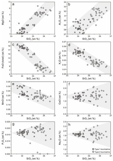 Major element variation diagrams for tourmaline from the Laodou gold deposit, showing the compositional differences between type 1 and type 2 tourmaline. (a) SiO2 versus MgO; (b) SiO2 versus Al2O3; (c) SiO2 versus FeO (total); (d) SiO2 versus K2O; (e) SiO2 versus MnO; (f) SiO2 versus CaO; (g) SiO2 versus P2O5; (h) SiO2 versus Na2O.