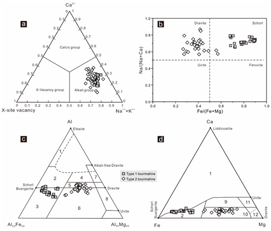 (a) Classification of the principal groups of tourmaline based on X-site occupancy [51]; (b) nomenclature of the tourmaline based on the classification diagram of Fe/(Fe + Mg) versus Na/(Na + Ca) [52]; (c,d) ternary Al-Fe-Mg and Ca-Fe-Mg diagrams showing compositions of tourmaline [53]. The regions define the compositions of tourmaline from different rock types. 1. Li-rich granitoids and associated pegmatites and aplites; 2. Li-poor granitoids and associated pegmatites and aplites; 3. Fe3+-rich quartz-tourmaline rocks (hydrothermally altered granites); 4. Metapelites and metapsammites coexisting with an Al-saturating phase; 5. Metapelites and metapsammites not coexisting with an Al-saturating phase; 6. Fe3+-rich quartz-tourmaline rocks, calc silicate rocks, and metapelites; 7. Low Ca metaultramafics and Cr, V-rich metasediments; 8. Metacarbonates and metapyroxenites; 9. Ca-rich metapelites, metapsammites, and calc-silicate rocks; 10. Ca-poor metapelites, metapsammites, and quartz-tourmaline rocks; 11. Metacarbonates; 12. Metaultramafics.