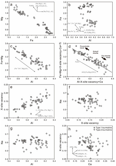 The binary diagrams show the compositional variation and substitution in type 1 and type 2 tourmaline samples. FeMg–1 is suggested by the negative correlations between Fe and Mg in the two types of tourmaline samples (Figure 8a). However, the shift of the plots out of the northward arrow of FeMg–1 suggest a substitution of Fe by Al (Figure 8b). This is proven by the strong negative correlation between Al and (Fe + Mg) (Figure 8c). The substitutions of FeMg–1 and FeAl–1 in type 1 and type 2 tourmaline are also supported by the projection of the data along the povondraite-“oxy-dravite” join, because these plots fall roughly parallel to the FeAl–1 and AlO((Fe, Mg)(OH)) –1 exchange vectors (Figure 8d). The positive correlation between X-site vacancy and Al suggests that the substitution of X-site vacancy Al–1 is also involved, alongside FeMg–1, and FeAl–1 in type 1 and type 2 tourmaline (Figure 8e). The Na content randomly distributes, along with the increase of X-site vacancy and Al, indicating that it is not the main influencing factor controlling the proportion of X-site vacancy and Al in tourmaline (Figure 8f,g). However, the negative correlation between X-site vacancy and Ca suggests that the X-site vacancy decrease in the tourmaline is caused by an increase of Ca content (Figure 8h), which suggests the substitution of X-site vacancy Ca–1 in type 1 and type 2 tourmaline.
