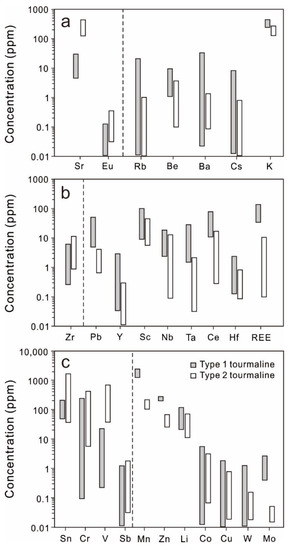 The mobility of redox-sensitive trace elements is controlled by the changes of the redox state [69]. V and Cr are redox-sensitive elements and their concentrations in tourmaline are indicators of oxygen fugacity of the parental hydrothermal fluids [66]. This is because V is commonly transported in hydrothermal fluids as the soluble species V4+ and V5+, rather than V3+ [70], whereas Cr is typically mobilized as Cr4+ under sufficiently oxidizing conditions [66]. Thus, the V and Cr concentrations in tourmaline have potential to act as an indicator of the redox state of hydrothermal fluids. In this study, type 2 tourmaline is characterized by remarkably higher V and Cr concentrations than type 1 tourmaline (Figure 11b), suggesting a higher oxygen fugacity of the parental fluids of type 1 tourmaline than type 2 tourmaline.