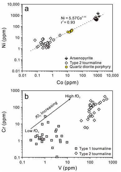 (a) Scatterplot of Co (ppm) versus Ni (ppm) in coexisting type 2 tourmaline and arsenopyrite [42] from the Laodou gold deposit. The Co and Ni contents of the host quartz diorite porphyry are shown for comparison [31]; (b) V (ppm) versus Cr (ppm) for type 1 and type 2 tourmaline samples from the Laodou gold deposit.