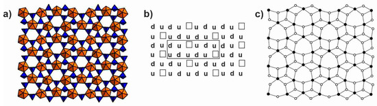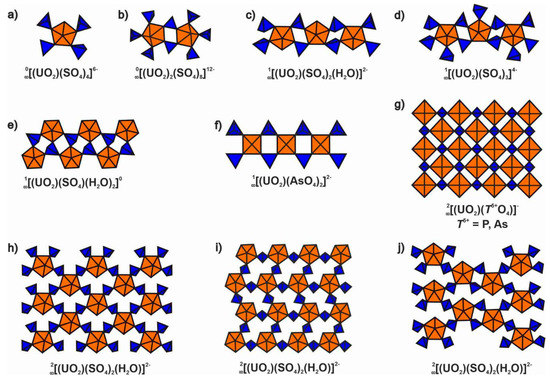A large number of uranium minerals with a common formula An+[(UO2)(TO4)](H2O)mXk adopt the structures based on autunite-related [(UO2)(TVO4)]− layers. Therein, A may stand for a single, double, or even triple-charged cation while T is P or As, and X is generally F or OH. The layers observed in the structures of magnesioleydetite, Mg(UO2)(SO4)2∙11H2O, straßmannite, Al(UO2)(SO4)2F∙16H2O [24], geschieberite, K2(UO2)(SO4)2∙2H2O [25], and leydetite, Fe(UO2)(SO4)2∙11H2O [26] are topologically identical (Figure 1h). Therein, four out of five equatorial vertices of uranium polyhedra are occupied by oxygen atoms of sulfate tetrahedra while the fifth is occupied by a water molecule; all such vertices are similarly oriented in the layer plane. The layers in the structure of wetherillite, Na2Mg(UO2)2(SO4)4∙18H2O [12], differ in that the vertices occupied by water molecules exhibit two positions (Figure 1i). Yet another layered arrangement is formed by vertex-sharing UO6(H2O) and SO4 moieties (Figure 1j) in the structure of beshtauite, (NH4)2(UO2)(SO4)2∙2H2O [27]. The topology of this layer is similar to that of goldichite, KFe(SO4)2∙4H2O [28].