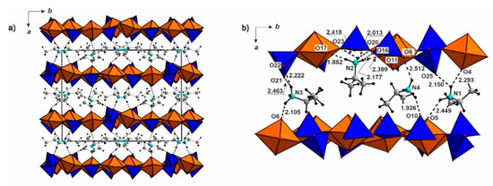 The bond valence sums for U and Mo were calculated using parameters given in [33]: 5.98, 6.17 and 6.14 for U1, U2 and U3, and 6.12, 6.02, 5.86, 5.93 and 6.39 for Mo1, Mo2, Mo3, Mo4 and Mo5, respectively. These values are in agreement with the reference data except for the somewhat overbonded Mo5 centering a strongly distorted tetrahedron (Mo-O distances to O24, O13, O26 and O25 are 1.765(13) Å, 1.767(12) Å, 1.702(14) Å, and 1.666(16) Å). This distortion is likely due to a strong N-H···O hydrogen bond (d (N1–O25) = 2.150 Å) (Figure 2b).