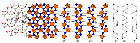 The [(UO2)3(MoO4)5]4− layer in 1 (Figure 4) can be also described as consisting of several modules, i.e., fundamental chains С1, С2, С`1. The C1 and С`1 chains are related by a mirror plane. In C1 chains, (U1O2)O5 and (U2O2)O5 bipyramids share vertices with Mo1O4 and Mo2O4 tetrahedra, to form the [(UO2)2(MoO4)4]4− complexes linked via additional Mo3O4 species. С2 chains are formed from two (U3O2)O5 bipyramids and Mo4O5 and Mo5O5 species. The chains are stacked in the following sequence ...C1C2C`1C1C2C`1…