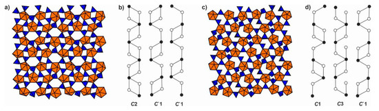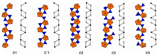 The NTs in the structure of (C4H12N)14[(UO2)10(SeO4)17(H2O)] [42] can be dissected into ten chains (Figure 6i). In this case, the mutual arrangement of the polyhedra differs somewhat from the above discussed cases. Three chains (C`1, C`1, C2) form a ribbon cut from the UO2:TO4 = 3:5 layer.