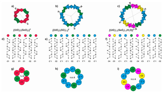 The approach to the description of nanotubules as structural entities formed by layer scrolling is classic, and was applied for carbon NTs [45], transition-metal chalcogenides (MoS2, MoSe2, WS2, WSe2, NbS2 and NbSe2) [46], as well as oxides (TiO2, VOx, CuO, Al2O3, SiO2, etc.) [47]. The topology of the smallest nanotubules (Figure 6a) corresponds to that of [(UO2)3(CrO4)5]4− layers found in the structures of Mg2[(UO2)3(CrO4)5]·17(H2O) and Ca2[(UO2)3(CrO4)5]·19(H2O) [48]. The [(UO2)6(SO4)10]8− nanotubules (Figure 6b) are produced from a similar layered archetype [44]. However, there are no layered “ancestors” for the [(UO2)10(SeO4)17(H2O)]14− nanotubules (Figure 6c), yet their local topology is similar to those of 3:5 layers, which were found, e.g., in the structure of Rb4[(UO2)3(SeO4)5(H2O)] [49].